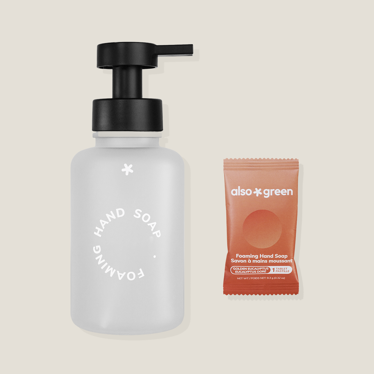 A complete foaming hand soap kit with a reusable glass bottle. Just add the tablet to water for a rich, airy lather with every pump. Plastic-free, beautifully scented, and made to refill again and again.